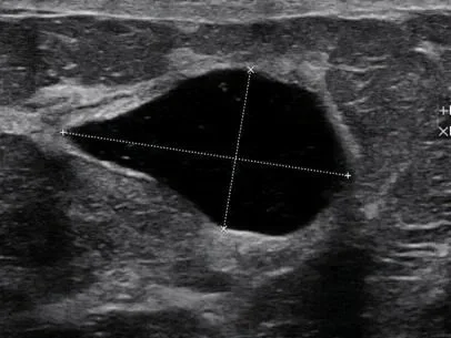 The cyst is clearly seen on the ultrasound and appears as a “black” lesion, the dense tissue seen around it doesn’t block the view.